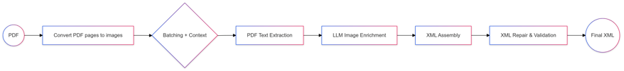 The process concludes with a properly structured, validated XML file that integrates all the information extracted and enriched from the PDF.